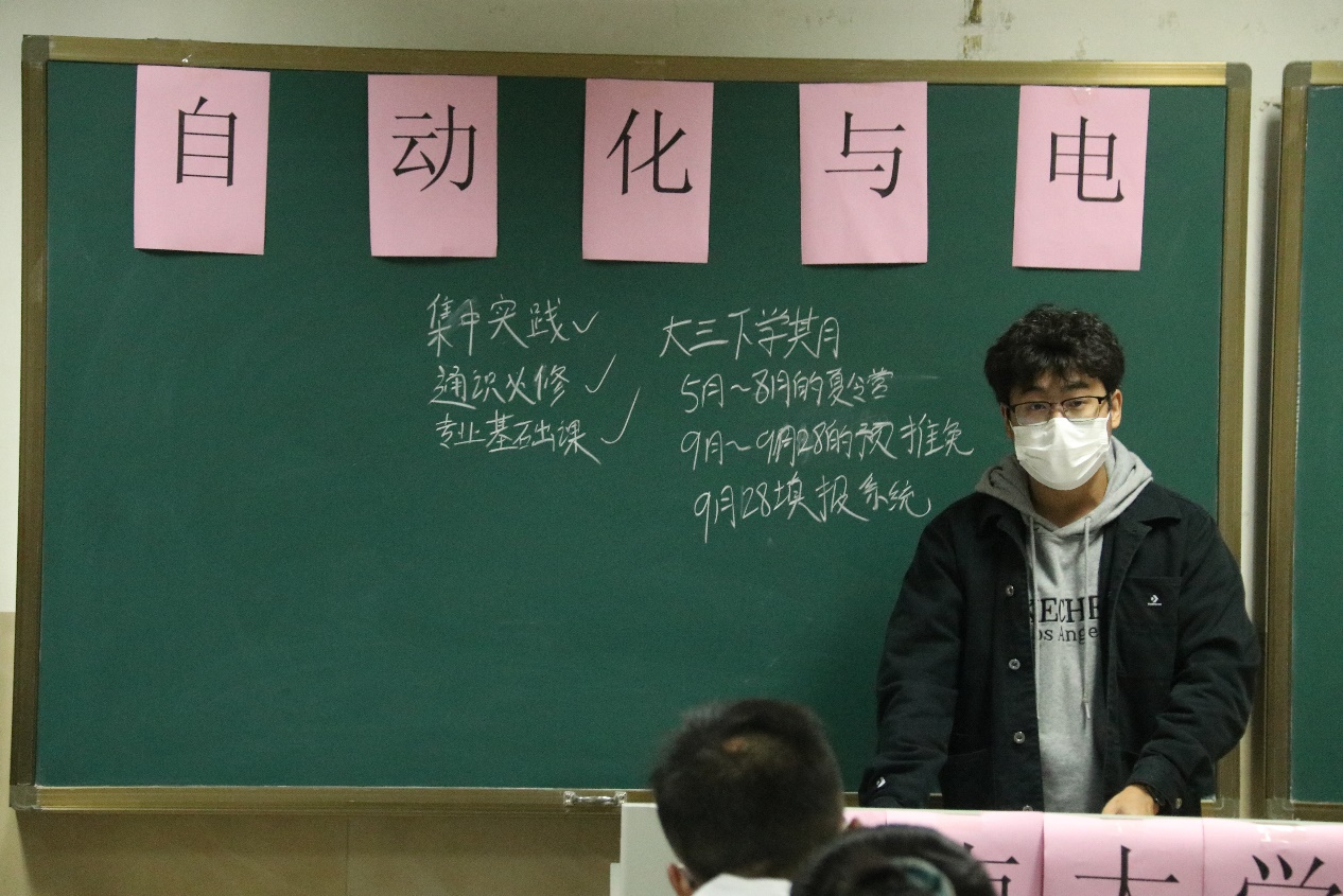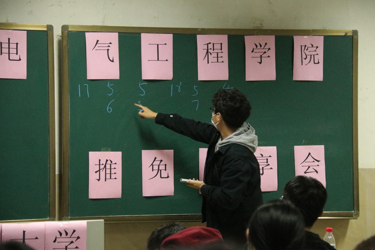 本次活动邀请到了2019级获得推免资格的学生代表,分别是朱鑫鑫和徐志强。其中,朱鑫鑫学长成功推免至山东大学。他首先给学弟学妹们讲了有关推免的基本流程和具体时间点,重点强调了,每位要想要申请推免的同学都需要提前了解推免的流程,做好自己的规划,尤其是新生更应提前寻找一个适合自己的目标,并为之奋斗努力。徐志强学长成功推免至华北电力大学,他从如何准备推免、选取推免学校、选取专业方向、把握复习节奏、提高学习效率等方面向大家传授经验,引导学弟学妹们把握关键点、少走弯路。